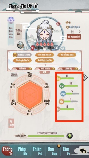 Một yếu tố then chốt khác chính là Linh Căn Ngũ Hành. Khi Tông Chủ trang bị pháp bảo, phụ kiện hoặc trang bị có chỉ số ngũ hành cao, các chỉ số này sẽ cộng hưởng với linh căn để tăng sát thương.