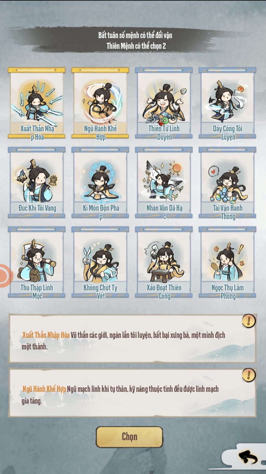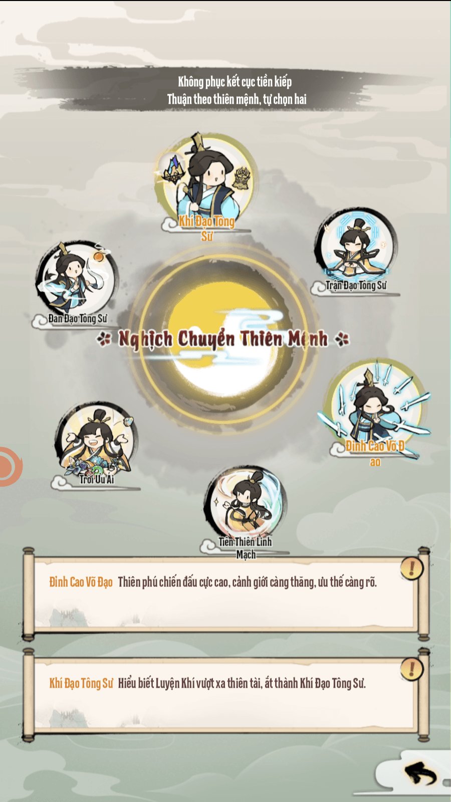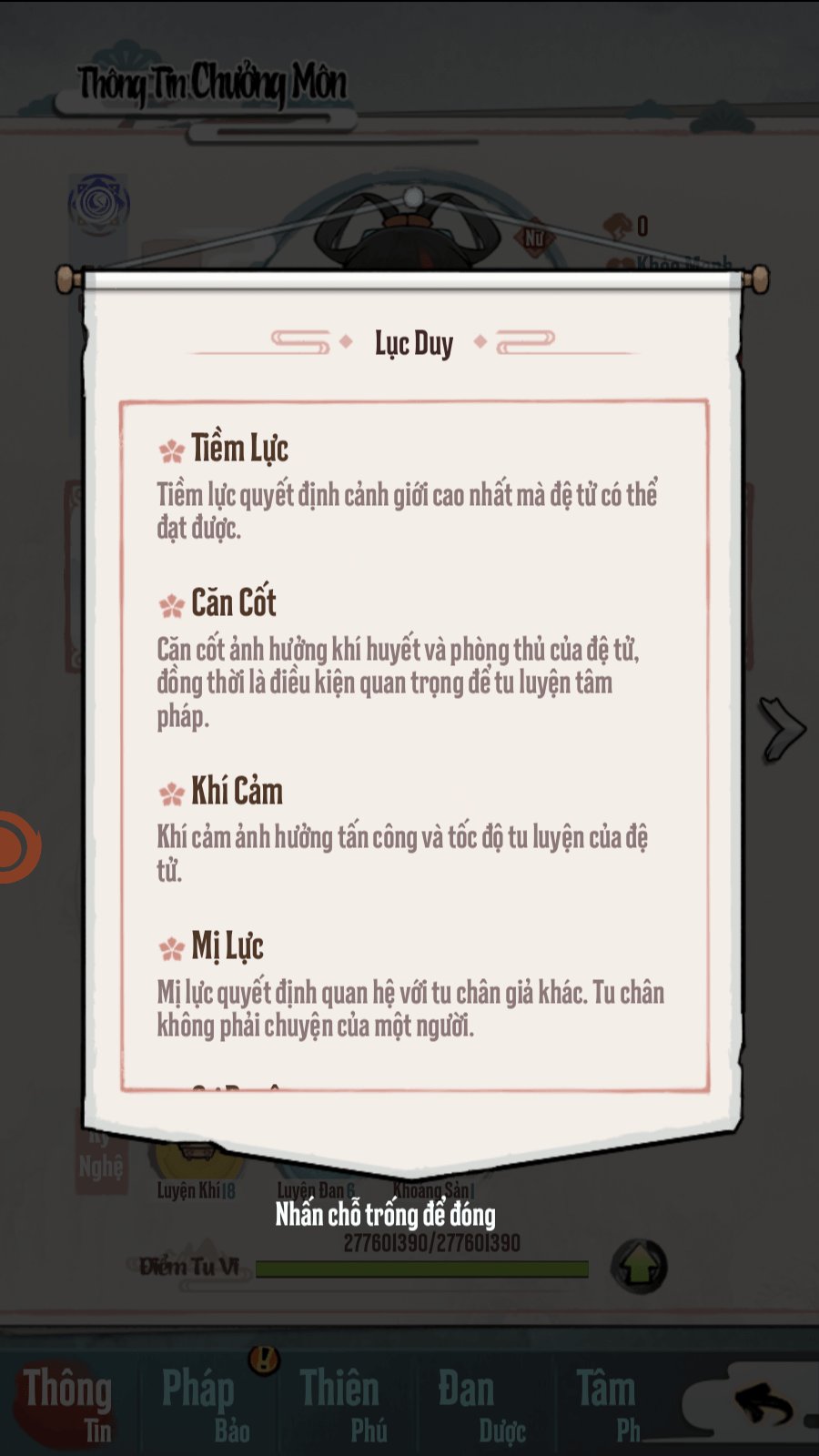Lưu ý từ Tiểu sư muội: Nhiều người chơi hay chọn Chưởng môn (Tiên Thiên Linh Mạch + Võ Đạo Đỉnh Phong) và Đại sư huynh (Xuất Thần Nhập Hóa + Ngũ Hành Kết Hợp). KHÔNG khuyến nghị cách build này cho dân cày chay (F2P) vì đầu game rất khó kiếm đệ tử luyện khí, và sách luyện khí ở server mới giá cực kỳ chát!