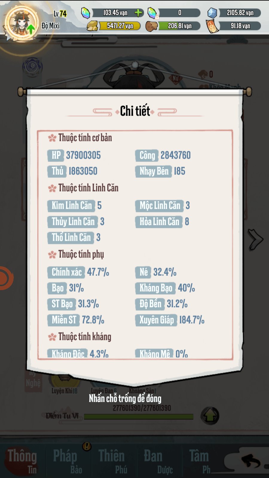 Để nhân vật "trâu bò" hơn, người chơi thường stack Khí Huyết (HP) thay vì tập trung vào Phòng Ngự (do hiệu quả phòng ngự không cao). Cần chú trọng: Tổng ngũ hành, Giảm sát thương, Miễn sát thương, Linh căn và Tâm pháp.
