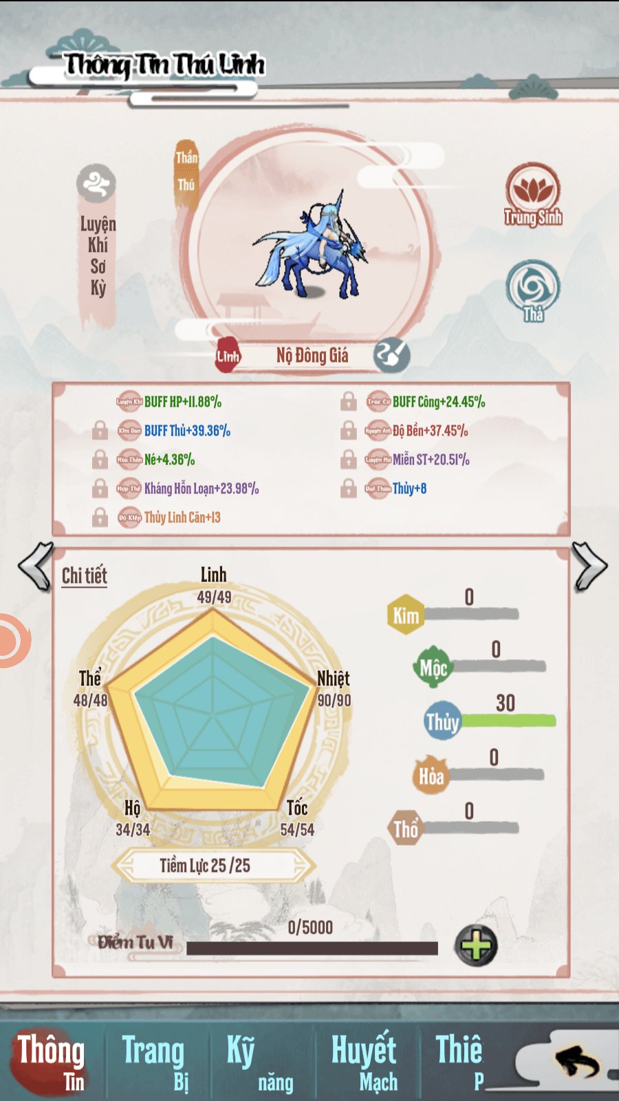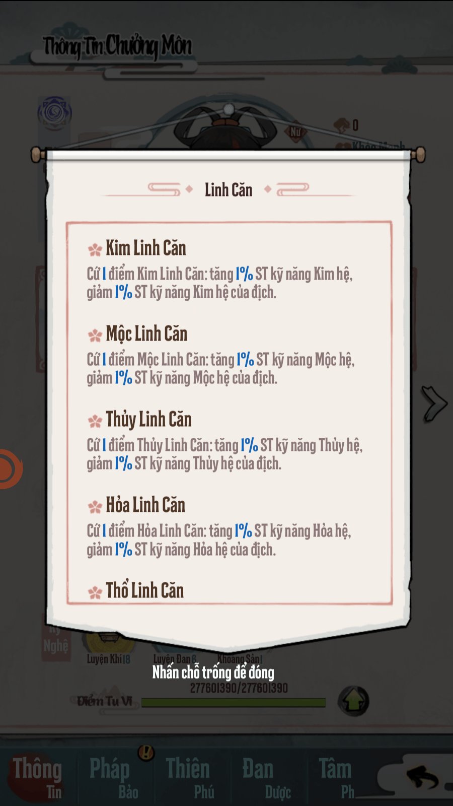 - Tiên Thiên Linh Mạch: Giúp tăng hệ số ngũ linh căn, từ đó tăng sát thương và khả năng khắc chế ngũ hành.