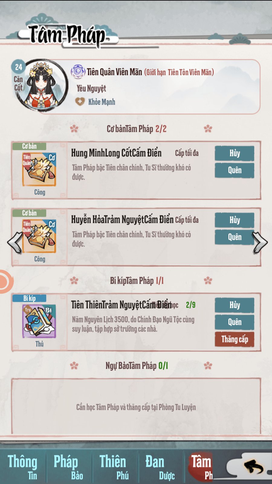 - Kẹt Cửu Đệ: Quay lại farm ải Tu Di để cày cuốc, up lên Hợp Thể và học đầy đủ Tâm pháp.